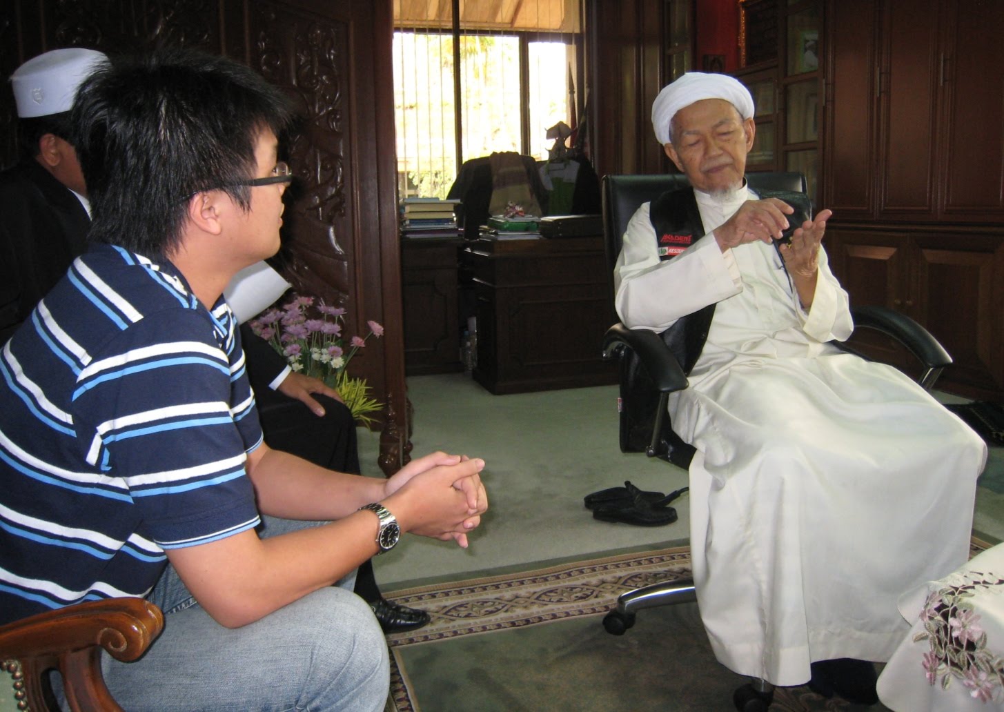 Seterusnya, Nik Aziz bertanya samada kami tahu tentang sejarah kedatangan Islam ke Tanah Melayu. Beliau berkata, Islam sampai di Tanah Melayu 500 tahun lalu, iaitu pada zaman Parameswara, tetapi Islam sampai di Negara China lebih 1,100 tahun yang lalu. Ini bermaksud tamadun Islam mula bertapak di Negara China 600 tahun lebih awal daripada Islam memasuki Tanah Melayu. Orang daripada Negara China yang membawa Islam ke Tanah Melayu, kata beliau. Beliau juga sebut mengenai ketiga-tiga cucunya ada belajar bahasa Cina dan beliau mempunyai seorang anak angkat warganegara China. Seorang anak kepada anak angkat tersebut yang berada di bawah jagaan beliau baru sahaja mendapat kewarganegaraan Malaysia. Beliau turut bergurau bahawa beliau ingin berkahwin dengan seorang isteri Cina. Suasana menjadi kurang tegang dan lebih senang hati. Perbualan dengan Nik Aziz membuatkan saya memahami bahawa beliau bukan sahaja seorang pemimpin yang buka minda, malah beliau seorang pemimpin politik yang berani dan terus terang. Pemikiran beliau yang terbuka dan gaya beliau yang jujur jauh lebih baik daripada mereka-mereka yang berfikiran perkauman yang sempit.